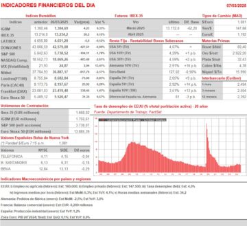 • Para empezar, y en línea con el negativo comportamiento de AYER de Wall Street y de las bolsas asiáticas esta madrugada, esperamos que los principales índices bursátiles europeos abran a la baja. HOY los inversores tienen otra importante cita macroeconómica, ya que esta tarde se dará a conocer en EEUU el informe de empleo no agrícola del mes de febrero, informe que deberá aportar mucha información sobre cuál es el estado actual del mercado laboral estadounidense. Hay analistas que esperan que unas cifras por debajo de lo esperado -se estima que la economía de EEUU ha generado 160.000 nuevos empleos no agrícolas en el mes- será bien recibido por los inversores porque forzará a la Reserva Federal (Fed) a bajar sus tasas de interés antes de lo esperado.