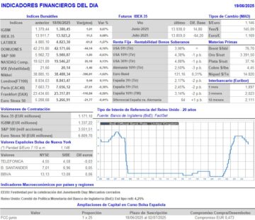 • En una sesión en la que el conflicto de Oriente Medio siguió siendo la principal referencia, restando protagonismo a la reunión del Comité Federal de Mercado Abierto (FOMC) del banco central estadounidense, los principales índices bursátiles europeos cerraron AYER en su mayoría a la baja, con excepciones como la del Ibex-35, la del FTSE Mib italiano o la del FTSE 100 británico, que lo hicieron con ligeros ascensos. Todos estos índices, tras comenzar el día con ligeros avances, fueron perdiendo fuerza, pasándose la mayor parte del resto de la jornada en negativo, para cerrar la misma muy cerca de sus niveles más bajos. En estos mercados siguió pesando la incertidumbre que ha generado el estallido de la guerra entre Israel e Irán y, sobre todo, la posibilidad de que EEUU opte por intervenir directamente, lo que daría al conflicto una escala superior, con resultados aún más inciertos.