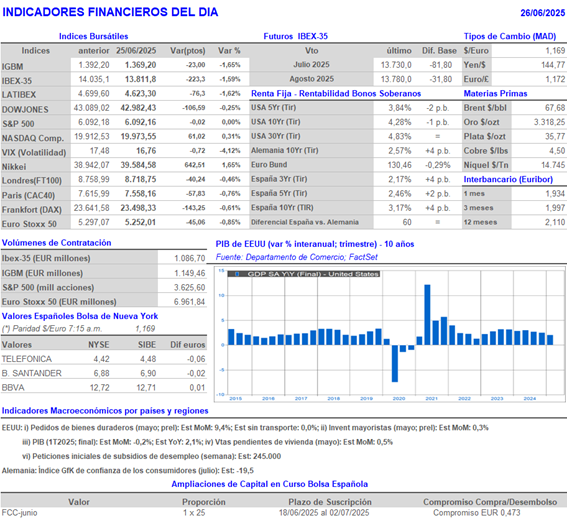 - HOY en la agenda macroeconómica del día destaca sobre todo la publicación en EEUU de la tercera y última lectura del PIB estadounidenses del 1T2025, que esperamos sea similar a la preliminar y que confirme que esta economía se contrajo un 0,2% en el trimestre mencionado con relación al 4T2025, lastrado por el fuerte incremento de las importaciones.