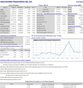- Destacar que en la agenda macroeconómica del día destaca la publicación en la Eurozona, sus principales economías, el Reino Unido y EEUU de la lectura final de junio de los índices de gestores de compra del sector manufacturero, los PMI manufacturas que elabora S&P Global y el ISM manufacturas estadounidense.