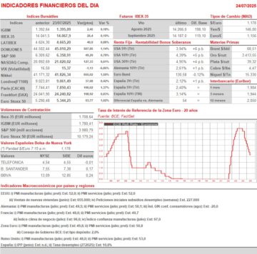 - Para empezar, esperamos que HOY los principales índices bursátiles europeos abran al alza, animados los inversores por la posibilidad de que la UE cierre un acuerdo comercial similar al de Japón con EEUU. Además, la sesión tiene una cita muy relevante, ya que el BCE reúne esta mañana a su Consejo de Gobierno. Si bien, lo más factible es que el organismo haga una pausa en su proceso de bajadas de tipos, manteniendo los mismos al nivel de junio -el de depósito al 2%-, será muy interesante analizar lo que indique el Consejo y su presidenta, la francesa Lagarde, sobre potenciales nuevos movimientos de tipos. Respecto a la agenda macroeconómica, HOY se darán a conocer en la Eurozona, sus principales economías: Alemania y Francia, el Reino Unido y EEUU las lecturas preliminares de julio de los índices adelantados de actividad de los sectores manufacturero y de servicios, los PMIs que elabora S&P Global.