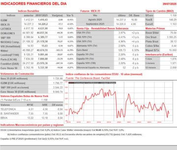 - Esperamos que la sesión de HOY comience al alza, con los índices europeos intentando recuperar algo de lo cedido AYER, aunque con los inversores tratando de evaluar el impacto que los acuerdos comerciales están teniendo sobre las empresas de la región. Tenemos que destacar que Trump ha amenazado con imponer una tarifa global de entre el 15% y el 20% a todas las importaciones procedentes de países con los que a la fecha límite del 1 de agosto, no haya alcanzado un acuerdo comercial, lo que mantiene una cierta incertidumbre en los mercados bursátiles. Por lo demás, HOY la agenda macroeconómica será más intensa que la de AYER, con la publicación de la lectura preliminar de la estimación del PIB del 2T2025 en España, así como las expectativas de inflación de los consumidores de la Eurozona del mes de junio. Por la tarde, en EEUU los inversores contarán con la publicación en EEUU del índice de vivienda Case Shiller del mes de mayo, de las ventas minoristas de junio, con el índice de confianza de los consumidores elaborado por The Conference Board, del mes de julio, que se espera haya repuntado con respecto al del mes anterior y la encuesta sobre vacantes de empleo (JOLTS), que se estima haya caído ligeramente con respecto a la encuesta del mes anterior.