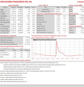 - HOY la jornada estará marcada por dos aspectos: es la fecha límite que anunció Trump para alcanzar un acuerdo EEUU con sus socios comerciales, so pena de aumentar de forma severa los aranceles a aquellos socios que no hayan negociado, o no hayan alcanzado un acuerdo, y se publican en EEUU los datos de empleo privado no agrícola, que ofrecerán una mejor visión sobre el mercado laboral estadounidense, unos datos que tienen una gran relevancia en un momento en que se duda si la Fed bajará o no los tipos de interés en la reunión del FOMC en septiembre. Asimismo, los inversores contarán con múltiples referencias macroeconómicas y empresariales, al publicarse en la Eurozona y sus principales economías, Alemania, Francia, España e Italia, los datos finales de julio de la actividad del sector manufacturas, PMI manufacturas, así como los datos preliminares de julio de la inflación de la Eurozona. Por la tarde, en EEUU, además de los datos referidos de empleo, también se publicarán los datos de actividad del sector manufacturas, PMI manufacturas de S&P Global y el ISM manufacturas del Institute of Supply Management (ISM) del mismo mes, y la lectura final del índice de sentimiento de los consumidores, elaborado por la Universidad de Michigan. Esperamos una apertura en Europa a la baja, con los inversores manteniéndose a la espera de la publicación de los datos del empleo, y con “la oreja puesta” en cualquier noticia procedente del tema “tarifas” que podrían condicionar la evolución del cierre.