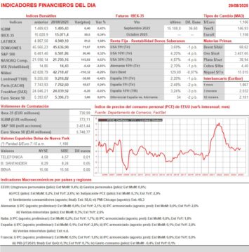 • HOY, última sesión del mes de agosto, será la macroeconómica la que centre la atención de los inversores, concretamente la inflación, tanto en Europa como en EEUU. Así, y a lo largo de la mañana se irán publicando en las cuatro mayores economías de la Eurozona: Alemania, Francia, Italia y España, las lecturas preliminares de la inflación de agosto. Ya por la tarde (14:30 horas; CET) y en EEUU, el Departamento de Comercio dará a conocer la lectura de julio del índice de precios del consumo personal, el PCE, la variable de precios más seguida por la Reserva Federal (Fed), que la utiliza para realizar sus proyecciones de inflación y para diseñar su política monetaria. Para empezar la sesión de HOY, esperamos que los principales índices bursátiles europeos abran de forma mixta y sin grandes cambios, a la espera de conocer la lectura del PCE estadounidense de agosto, que creemos será la que determine en gran medida la tendencia de cierre de estos mercados.
