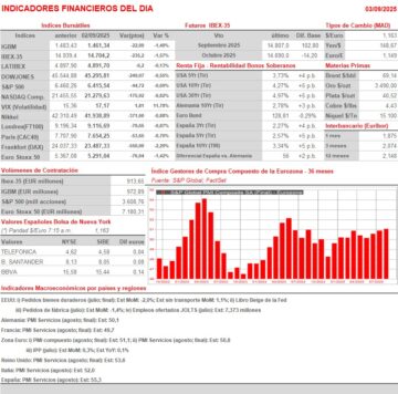 - En Wall Street la sesión de AYER también acabó a la baja, con todos sus principales índices cerrando con significativos descensos, aunque lejos de sus niveles más bajos del día. En este mercado también fueron los bonos uno de los principales factores que lastraron el comportamiento de la renta variable durante la sesión. Así, la incertidumbre que se ha generado sobre la legalidad de los aranceles impuestos por Trump de forma generalizada sobre las importaciones estadounidenses después de que el tribunal de apelación los declarará ilegales, aunque los mantiene efectivos hasta el 14 de octubre para que sea el Tribunal Supremo el que decida sobre el tema, pesó mucho en el comportamiento tanto de la renta fija como de la variable.