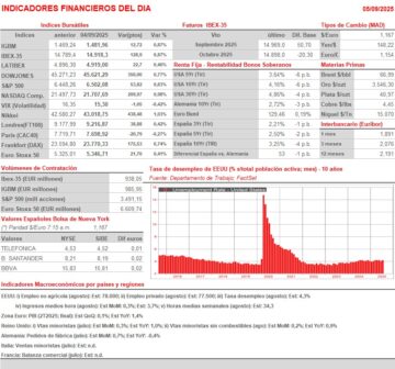 • En Wall Street la sesión de AYER estuvo monopolizada por completo por las cifras que sobre el mercado laboral se han dado a conocer en los últimos dos días, cifras que abren la puerta a varias bajadas de los tipos de interés oficiales en los próximos meses. Así, el miércoles, las cifras de empleos ofertados de julio, que recoge la encuesta JOLTS, se situó por primera vez desde la pandemia por debajo del número de personas que buscan empleo. A su vez, AYER la creación de empleo privado neto en agosto, datos que dio a conocer la procesadora de nóminas ADP, quedó muy por debajo de lo esperado por los analistas, mientras que el número de peticiones iniciales de subsidios de desempleo semanales se situó a su nivel más elevado en más de dos meses. Todos estos datos apuntan a un mercado laboral que sigue debilitándose, aunque de forma moderada. Tras la publicación de estas estadísticas de empleo, la opinión generalizada entre los analistas e inversores es que la Reserva Federal (Fed) bajará sus tasas oficiales en la reunión que celebrará su Comité Federal de Mercado Abierto (FOMC) a mitad de mes y que lo hará alguna vez más antes de que acabe el año. Así, AYER, tanto los bonos como las acciones “celebraron” con alzas este hipotético escenario -el S&P 500 marcó un nuevo máximo histórico-, convirtiéndose “las malas noticias” en “buenas noticias” para los mercados.