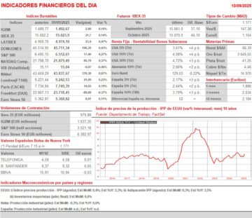 • HOY será la publicación en EEUU del índice de precios de la producción (IPP) del mes de agosto lo que centre la atención de los inversores. Para empezar la jornada, esperamos que los principales índices bursátiles europeos abran ligeramente al alza, siguiendo de esta forma la estela dejada anoche por Wall Street y esta madrugada por las principales bolsas asiáticas, que han terminado el día en su mayoría con avances, con los índices apoyados en el buen comportamiento del sector tecnológico, especialmente de los valores de las empresas fabricantes de semiconductores. En lo que hace referencia a la bolsa española, cabe destacar que esta madrugada la empresa Inditex (ITX), la de mayor capitalización del Ibex-35, ha dado a conocer sus cifras correspondientes al 1S2025, resultados que han quedado tanto a nivel ventas como de beneficio neto por debajo de lo esperado por el consenso de analistas. Es factible, por tanto, que la primera reacción de las acciones de la compañía sea negativa cuando abra el mercado esta mañana, lo que, de ser así, lastrará el comportamiento del Selectivo en su conjunto.