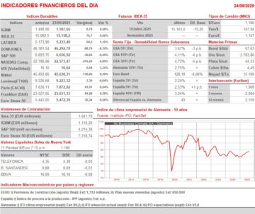 - HOY, y en un día de escasas referencias macroeconómicas y empresariales -lo más relevante es la publicación de los índices de clima empresarial de septiembre en Alemania, los que elabora el instituto alemán IFO y para los que no se esperan grandes cambios con relación a sus lecturas de agosto-, esperamos que los principales índices bursátiles europeos abran ligeramente a la baja, siguiendo de esta forma la estela dejada AYER por Wall Street.