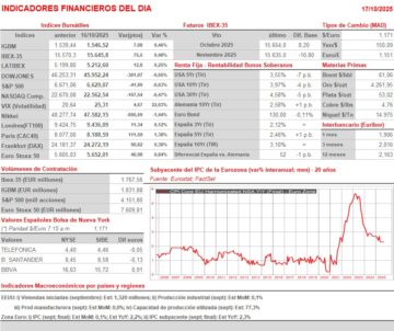 - En Wall Street la sesión de AYER fue claramente de más a menos, tras comenzar el día los índices con sensibles avances, apoyados en los buenos resultados trimestrales y, una vez más, en los valores relacionados con la Inteligencia Artificial (IA) -AYER la multinacional Oracle (ORCL-US), en una reunión con analistas, se mostró muy optimista sobre el “retorno” de las fuertes inversiones que se están realizando en el sector-. Sin embargo, y a medida que avanzaba la jornada, los índices se giraron a la baja, arrastrados por el sector bancario, concretamente por los bancos regionales. En ese sentido, señalar que dos bancos regionales: Zions Bancorp (ZION-US) y Western Alliance (WAL-US), anunciaron que iban a dotar provisiones para cubrir pérdidas generadas por varios prestatarios vinculados a otras entidades crediticias del sector y contra los que iban a presentar demandas de fraude.