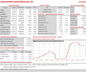- Esperamos que HOY los principales índices europeos abran ligeramente a la baja, sin una tendencia definida, a la espera de los acontecimientos del día, aunque la decisión de la Fed se conocerá ya con estos mercados cerrados, por lo que su evolución estará marcada por los resultados empresariales que se den a conocer, y por la apertura de Wall Street. La agenda macroeconómica es muy limitada, con la estimación preliminar de crecimiento del PIB de España del 3T2025 y el IPP de Italia del mes de septiembre y, en EEUU en principio se espera la publicación de las ventas pendientes de vivienda de septiembre.