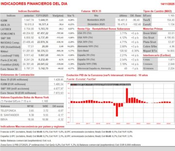 • Esperamos que HOY los índices bursátiles europeas abran con caídas, en una sesión de escasas referencias macroeconómicas, en la que Eurostat dará a conocer la segunda lectura preliminar del PIB del 3T2025 de la Eurozona, que esperamos confirme el crecimiento de esta economía en el periodo, mientras que en Francia y España los institutos de estadísticas locales publicarán las lecturas finales del IPC de octubre, lecturas que también deben servir para confirmar que la inflación sigue débil en la primera de estas economías y muy alejada del objetivo del 2% del BCE en el caso de la segunda. Por lo demás, cabe destacar que esta madrugada el dólar se mantiene estable con relación a la mayoría de las principales divisas mundiales; que el precio del petróleo viene subiendo con cierta intensidad; que el precio del oro sube ligeramente; y que los precios de las principales criptomonedas presentan importantes caídas.