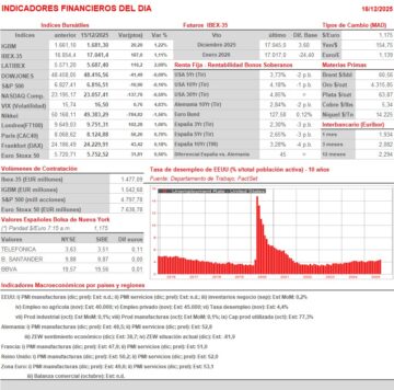 - HOY en la agenda macroeconómica destaca la publicación en la Eurozona, Alemania, Francia, Reino Unido y EEUU de las lecturas preliminares de diciembre de los índices adelantados de actividad sectoriales, los PMIs manufacturas y de servicios, que elabora S&P Global. Además, y en Alemania, el instituto ZEW dará a conocer sus índices de diciembre, índices que evalúan la percepción que sobre la economía alemana, situación actual y expectativas, tienen los grandes inversores y los analistas. No obstante, y a pesar de la relevancia de los mencionados índices, HOY la atención de los inversores prácticamente la monopolizará el informe de empleo no agrícola de noviembre (también se dará a conocer el de octubre) que publica esta tarde el Departamento de Comercio de EEUU. Para empezar, y a la espera de la publicación a lo largo del día de la importante batería de datos macroeconómicos que hemos detallado anteriormente, esperamos que los principales índices bursátiles europeas abran HOY a la baja, siguiendo de esta forma la estela de los asiáticos, que han cerrado con significativas caídas, liderados por los índices chinos.
