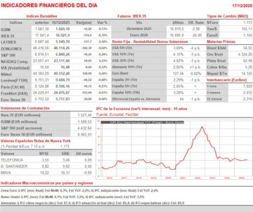 - Esperamos que HOY los principales índices bursátiles europeos abran ligeramente al alza, en línea con el comportamiento mostrado de madrugada por las bolsas asiáticas más importantes, que han cerrado con ganancias. Posteriormente, y un día más, será la apertura de Wall Street la que determine la tendencia que adoptan estos mercados al cierre de su sesión. La agenda macroeconómica se centra básicamente en Europa, donde se publicarán las lecturas de la inflación del mes de noviembre tanto en la Eurozona (lectura final del mes) como en el Reino Unido. Además, y en Alemania, el instituto IFO dará a conocer sus índices que evalúan el clima empresarial en el país, correspondientes al mes de diciembre.