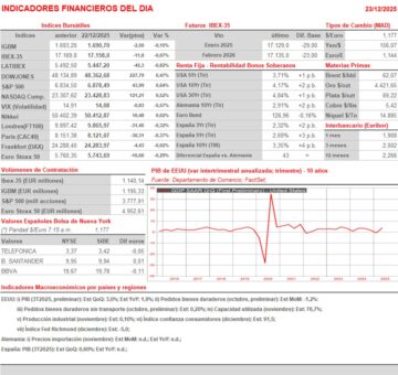- Esperamos que HOY, en la última sesión completa de la que dispondrán esta semana los inversores europeos y estadounidenses (MAÑANA miércoles la mayoría de los mercados abrirá media jornada o incluso permanecerán cerrados, y el jueves y el viernes estarán cerrados todos) los índices europeos abran de forma mixta. En la agenda macroeconómica destaca sobre todas las referencias la segunda estimación del PIB de EEUU del 3T2025, de la que el consenso de analistas de FactSet espera que haya repuntado un 3,0%. Adicionalmente, los inversores contarán con la publicación de los precios de importación de Alemania, correspondientes al mes de noviembre, la estimación final de crecimiento del PIB de España del 3T2025, que se espera haya disminuido ligeramente con respecto al del 2T2025, y en EEUU además del mencionado PIB, también se publicarán los pedidos de bienes duraderos de octubre, la producción industrial del mes de noviembre, la capacidad utilizada de octubre, el siempre interesante índice de confianza de los consumidores del mes de diciembre, que se espera haya mejorado con respecto al de noviembre, y el índice manufacturero de la Reserva Federal de Richmond de diciembre, del que también se espera una mejoría.