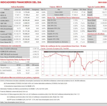 - Los principales índices bursátiles europeos cerraron AYER en su mayoría a la baja, con excepciones puntuales como el Dax alemán, que cerró por primera vez en su historia por encima de los 25.000 puntos, y del FTSE Mib italiano. La jornada en las bolsas tuvo un cierto carácter defensivo, algo a lo que contribuyó el nuevo repunte de los precios de los bonos y la consiguiente caída de sus rentabilidades. La elevada tensión geopolítica, que abarca desde Venezuela a Oriente Medio, pasando por Ucrania y Groenlandia, así como por China y Japón, está propiciando una actitud algo más prudente de los inversores, que en renta variable AYER optaron por sectores como el inmobiliario patrimonialista, el farmacéutico o el de las utilidades, así como por el de la construcción y materiales, sector éste que puede verse muy beneficiado en un hipotético proceso de reconstrucción de Ucrania. En sentido contrario, AYER fue el sector de la energía el que peor se comportó, lastrado por la nueva caída del precio del crudo, variable que está mostrando una gran volatilidad ante la incertidumbre generada por la intervención de EEUU en Venezuela y ante los planes de la Administración estadounidense para el país y para su sector petrolero.