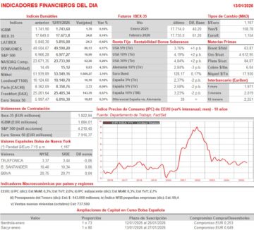 - HOY se inicia de forma oficiosa la temporada de publicación de resultados trimestrales en Wall Street, temporada que inicia, entre otras compañías, el mayor banco del país, JP Morgan (JPM-US), y una de las aerolíneas más relevantes, Delta Air Lines (DAL-US). Además, el Departamento de Trabajo de EEUU dará a conocer la lectura del IPC estadounidense, correspondiente al mes de diciembre. Esperamos que HOY los índices bursátiles europeos abran entre planos y/o ligeramente al alza, y que continúen moviéndose en un estrecho intervalo de precios hasta que se publique el IPC de diciembre en EEUU, dato que entendemos determinará en gran medida la tendencia de cierre de estos mercados.