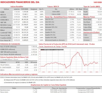 - HOY la agenda macroeconómica del día trae citas interesantes, como son la publicación en EEUU de las ventas minoristas y del índice de precios de la producción (IPP), ambos del mes de noviembre. En la agenda empresarial destaca la publicación de los resultados del 4T2025 de otros tres grandes bancos estadounidenses: Bank of America (BAC-US), Citigroup (C-US) y Wells Fargo (WFC-US). No obstante, lo que más podría terminar condicionando el comportamiento de los mercados financieros occidentales en el día de HOY, si es que se da a conocer, sería el dictamen del Tribunal Supremo estadounidense sobre la utilización del gobierno del país de una ley de emergencia nacional para la implantación de aranceles generalizados a sus socios comerciales. Para empezar, esperamos que, como sucedió AYER, los principales índices bursátiles europeos abran HOY sin grandes cambios, siendo factible que durante la jornada intenten consolidar las alzas que han experimentado recientemente.