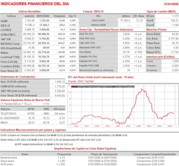 - HOY la atención de los inversores la centrará la intervención del presidente de EEUU, Trump, en Davos (Suiza), si es que se produce, ya que el avión en el que viajaba se ha dado la vuelta por un problema técnico. Está por ver si la reacción de los inversores y, sobre todo, el fuerte repunte de los rendimientos de los bonos -el del bono del Tesoro a 10 años se ha situado a su nivel más elevado desde agosto- hacen que Trump modere el tono y adopte una actitud menos agresiva con sus aliados, lo que permitiría reducir la tensión en los mercados. Esperamos que HOY los principales índices bursátiles europeos abran la jornada sin grandes cambios, probablemente a la baja, en línea con el comportamiento mostrado por los índices bursátiles asiáticos esta madrugada. Posteriormente, será todo lo relacionado con la crisis generada por Groenlandia lo que determine, para bien o para mal, el comportamiento de la renta variable durante la sesión.