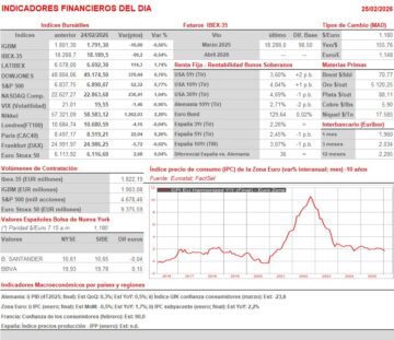 - HOY la agenda macroeconómica incluye varias citas de interés, entre ellas la publicación en Alemania de la lectura final del PIB del 4T2025 y en la Eurozona del IPC de enero, también en su lectura definitiva. No esperamos grandes cambios con relación a sus lecturas preliminares, por lo que no creemos que vayan a tener impacto en la marcha de las bolsas. Sí lo tendrán los múltiples resultados trimestrales que se darán a conocer en las plazas bursátiles europeas y en Wall Street, destacando sobre todo los de NVIDIA (NVDA-US), el mayor exponente mundial del fenómeno de la IA, al menos por el momento, que presentará sus cifras correspondientes a su 4T2026 ya con Wall Street cerrado. Para empezar el día, esperamos que HOY las bolsas europeas abran al alza, siguiendo de esta forma la estela dejada AYER por Wall Street y esta madrugada por las bolsas asiáticas, que han cerrado en su mayoría con importantes avances, impulsadas en muchos casos por los valores del sector del software. Posteriormente, será el comportamiento de Wall Street tras su apertura el que determine cómo cierran las bolsas europeas la jornada.