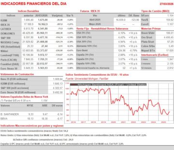 - AYER el presidente estadounidense anunció justo antes del cierre de Wall Street que EEUU suspendería los ataques contra el sector energético de Irán hasta el 6 de abril para que puedan celebrarse negociaciones de paz. Trump achacó la decisión a una petición de las autoridades iraníes, aunque actualmente es difícil determinar qué es cierto y qué no lo es. No obstante, el ganar tiempo para alcanzar un potencial final dialogado del conflicto creemos que será recibido con alivio cuando HOY abran las bolsas europeas, que esperamos lo hagan ligeramente al alza. En ello también creemos que contribuirá el hecho de que el precio del crudo parece haberse estabilizado esta madrugada y que los futuros de los índices de Wall Street muestran sensibles avances. Por lo demás, comentar que HOY se publica en España la lectura preliminar del IPC de marzo, lectura que servirá para hacerse una idea de hasta qué punto el incremento de los precios energéticos se ha trasladado ya a la inflación en este país. Los inversores, especialmente los de los mercados de bonos, estarán muy atentos a la publicación de este dato.