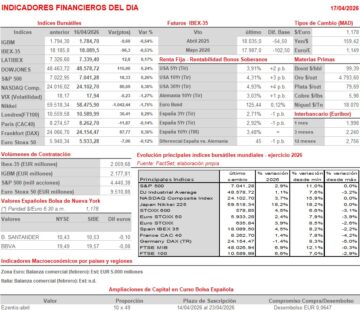 - HOY, en un día en el que las agendas macroeconómica y empresarial son muy livianas, los inversores seguirán muy pendientes de las noticias que sobre posibles nuevas negociaciones lleguen desde Oriente Medio. En ese sentido, cabe destacar que AYER, con la mediación estadounidense, se decretó un alto el fuego de 10 días en el Líbano, cesando por tanto los ataques entre Israel y los terroristas de Hezbolá. El presidente estadounidense, Trump, dijo además que las negociaciones con Irán podrían tener lugar este fin de semana. Esperamos que los principales índices bursátiles europeos abran HOY de forma mixta, probablemente en su mayoría con ligeros descensos, con los inversores mostrando una actitud prudente de cara a lo que pueda suceder este fin de semana, si es que EEUU e Irán vuelven a sentarse a negociar. Señalar, además, que en la bolsa española HOY vencen los contratos de derivados mensuales, lo que siempre genera alguna distorsión en el comportamiento del mercado de contado.
