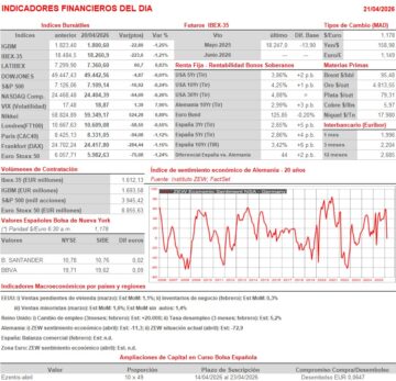 - Esperamos que las bolsas europeas abran al alza, intentando recuperar algo de lo cedido AYER, con los inversores animados por el hecho de que finalmente parece que HOY se van a retomar las conversaciones de paz entre EEUU e Irán. Pero, además del conflicto en Oriente Medio, los inversores tendrán otras importantes citas, empezando por la agenda macroeconómica, agenda en la que destaca la publicación esta mañana por parte del instituto alemán ZEW de sus índices que miden el sentimiento que sobre la economía de Alemania tienen los grandes inversores y los analistas, en este caso correspondientes al mes de abril. Además, y ya por la tarde, se darán a conocer en EEUU las cifras de las ventas minoristas de mes de marzo. Cabe destacar igualmente, que HOY la atención de los inversores, en especial los de los mercados de bonos, también la captará la audiencia de confirmación del nominado a presidente de la Reserva Federal, Kevin Warsh, ante el Comité Bancario del Senado.
