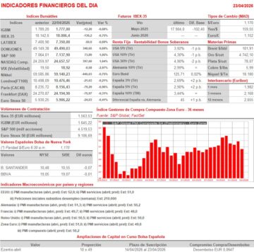 - HOY podremos comprobar si el conflicto de Oriente Medio está ya impactando en la actividad privada de las principales economías desarrolladas, ya que la consultora S&P Global dará a conocer en la Eurozona, sus dos principales economías: Alemania y Francia, el Reino Unido y EEUU las lecturas preliminares de abril de los índices adelantados de actividad sectoriales, los PMIs manufacturas y los PMIs de servicios. Esperamos que las bolsas europeas abran a la baja, en línea con el comportamiento mostrado esta madrugada por las principales bolsas asiáticas. Unos “malos” índices PMIs podrían acelerar las ventas en las bolsas europeas, sobre todo de los valores más ligados al ciclo económico.