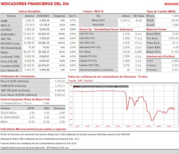 - En una sesión que estuvo marcada por las nuevas declaraciones del presidente de EEUU, Donald Trump, sobre aranceles y restricciones a las importaciones, en este caso de tecnología de semiconductores, y por la constatación de que todos estos temas han tenido ya un importante impacto en la confianza de los consumidores estadounidenses, los principales índices bursátiles europeos cerraron AYER en su mayoría con ligeros descensos, con el Ibex-35 desmarcándose del resto para bien y por segundo día de forma consecutivo, siendo capaz de terminar el día con un significativo avance, apoyándose en el buen comportamiento que mostraron AYER las acciones de los grandes bancos.