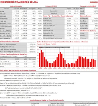 - Esperamos que HOY las bolsas europeas abran al alza, “celebrando”, entre otras cosas, el acuerdo alcanzado por los partidos alemanes que formarán parte de la nueva coalición de gobierno del país: la CDU y el SPD, acuerdo que sirve para relajar las normas fiscales y crear dos fondos para la inversión en defensa e infraestructuras. Posteriormente, serán las noticias que lleguen desde EEUU sobre el tema tarifas y las cifras macroeconómicas, lo que determine si los índices son capaces o no de mantener las ganancias iniciales. En la agenda macroeconómica destaca la publicación en la Eurozona, sus principales economías, el Reino Unido y EEUU de la lectura final de febrero de los índices de gestores de compra del sector servicios, los PMI servicios que elabora S&P Global. Cabe recordar que la lectura preliminar del citado mes del PMI servicios de EEUU dio la sorpresa, al señalar contracción mensual de la actividad por primera vez en más de dos años. Es por ello que HOY toda la atención la centrará un índice similar, el ISM del sector servicios, que elabora the Institute for Supply Management, y que es el más seguido por los inversores en Wall Street. Además, HOY la procesadora de nóminas estadounidense ADP publica las cifras de empleo privado del mes de febrero en EEUU, cifras que se espera sigan mostrando creación de empleo en el mes.
