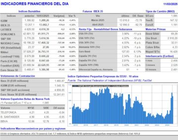 - HOY, y en una sesión en la que la agenda macroeconómica es muy ligera, destacando principalmente la publicación en EEUU del informe JOLTS de empleos ofertados del mes de enero, esperamos que el nerviosismo y la intranquilidad que vimos AYER en las bolsas occidentales continúe. esperamos que las bolsas europeas abran HOY ligeramente al alza, pero sin mucha convicción, en línea con el comportamiento que muestran los futuros de los principales índices estadounidenses. Eso sí, si estos se giran a la baja, las bolsas europeas irán detrás. Por lo demás, comentar que esta madrugada las bolsas asiáticas han cerrado con descensos generalizados, pero lejos de sus niveles más bajos del día; que el dólar vuelve a ceder terreno frente a las principales divisas europeas; que el precio del petróleo se muestra estable; que el del oro sube y que las principales criptomonedas vienen esta mañana con significativos avances.
