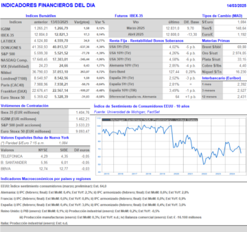 - HOY todo parece indicar que los senadores demócratas darán finalmente su apoyo (no todos) al plan para que el gobierno federal estadounidense no se quede parcialmente sin financiación, motivo por el cual los futuros de los principales índices estadounidenses vienen esta mañana al alza. Si a ello unimos el positivo comportamiento mostrado esta madrugada por las bolsas asiáticas que, lideradas por las chinas -se esperan nuevos estímulos para impulsar el consumo privado en el país-, han cerrado en su mayoría con significativos avances, hace que HOY “apostemos” por una apertura al alza de las bolsas europeas, en una jornada en la que se darán a conocer las lecturas finales de febrero de la inflación en Alemania, Francia y España. Además, esta tarde en EEUU, se publica la lectura preliminar de marzo del índice de sentimiento de los consumidores, que elabora la Universidad de Michigan.