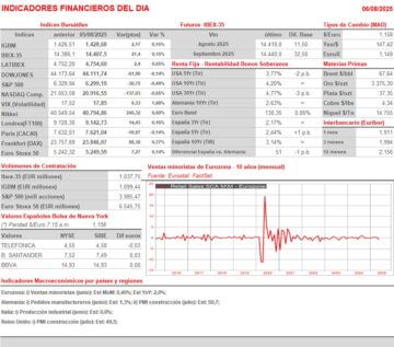 - La sesión en Wall Street de AYER fue muy diferente, ya que sus tres índices más importantes (DowJones: -0,14%; S&P 500: -0,49%; y Nasdaq Composite: -0,65%) cerraron con pérdidas, influidos por los mencionados datos peores de lo esperado por parte del índice de actividad de servicios ISM servicios, que es el que más sigue la Reserva Federal. El índice mostró, de forma inesperada, una lectura muy cerca del estancamiento (50,1 puntos) y por debajo de lo previsto, alimentando la preocupación sobre el estado de la economía estadounidense, que ya se puso de manifiesto el pasado viernes con los datos de empleo no agrícolas. Además, los comentarios del presidente Trump, anunciando nuevas tarifas sobre el sector de la fabricación de semiconductores y chips, tan pronto como la semana que viene, y unos posibles aranceles graduales sobre el sector farmacéutico, terminaron de lastrar la evolución de los índices estadounidenses.