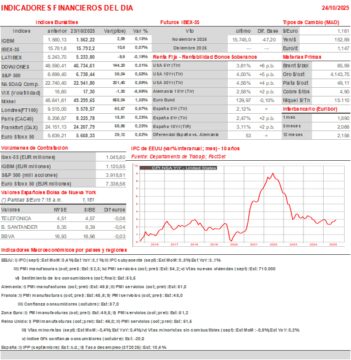 - Además, HOY la consultora S&P Global publicará en la Eurozona, sus dos principales economías: Alemania y Francia, el Reino Unido y EEUU las lecturas preliminares de octubre de sus índices adelantados de actividad sectoriales, los PMIs manufactureros y los de servicios. Se espera que estos indicadores continúen mostrando una ligera expansión de la actividad privada en Europa, gracias al sector servicios, y una algo más sólida en EEUU.Por último, y ya por la tarde, la Universidad de Michigan dará a conocer la lectura final de octubre de su índice de sentimiento de los consumidores estadounidenses.