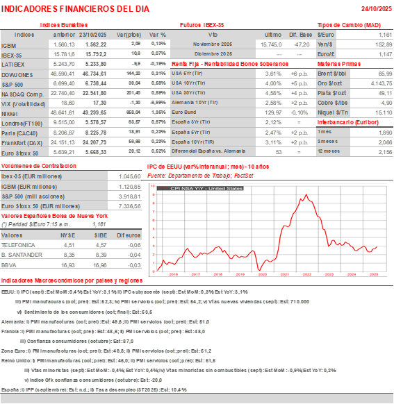 - HOY la gran cita del día será la muy esperada publicación en EEUU de los datos de la inflación del mes de septiembre (14:30 horas; CET), datos que deberían haberse publicado la semana pasada pero que no lo fueron como consecuencia del cierre del gobierno federal. En principio, se espera que la inflación general haya repuntado en el mes hasta el 3,1% desde el 2,9% del mes de agosto, y que su subyacente se haya mantenido estable, también en el 3,1%. En ambos casos, las lecturas se sitúan muy por encima del objetivo de la Reserva Federal (Fed) del 2,0%, aunque ello no creemos que impida al banco central estadounidense volver a bajar sus tasas de interés de referencia en 25 puntos básicos en la reunión que mantendrá la semana que viene su Comité Federal de Mercado Abierto (FOMC).