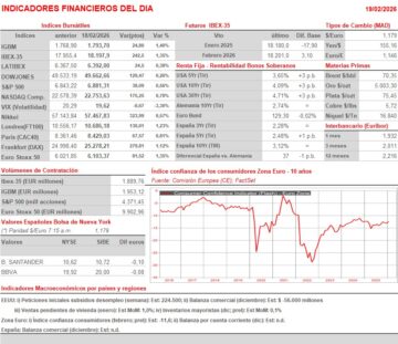 - En Wall Street la sesión fue también positiva, con todos sus principales índices cerrando el día con avances, aunque por debajo de sus niveles más altos de la jornada, alcanzados durante las primeras horas del día. Una batería de buenos datos macroeconómicos, entre ellos los de viviendas iniciadas (diciembre) y los de la producción industrial (enero) animaron a los inversores, que AYER apostaron claramente por los valores de crecimiento y por los tecnológicos, valores que, junto con los del sector de la energía y los de consumo discrecional, fueron los que mejor lo hicieron durante la sesión. Señalar, por otra parte, que la publicación de las actas de la reunión que mantuvo en enero el Comité Federal de Mercado Abierto (FOMC) de la Reserva Federal (Fed) enfrió algo los ánimos de los inversores ya que, por el momento, y según los comentarios de los distintos miembros del comité recogidos en las mencionadas actas, todo parece indicar que el banco central estadounidense va a optar por mantener sus tasas de interés de referencia sin cambios durante algún tiempo, al menos hasta que la inflación baje de los niveles actuales.