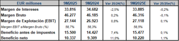 - SAN alcanzó un margen de intereses de EUR 33.816 millones en 9M2025, lo que supone una caída del 2,5% interanual (+1,5% a tipos de cambio constantes), aunque estuvo en línea (-0,2%) con respecto a la estimación del consenso de FactSet. Esta magnitud mostró un buen comportamiento, a pesar del contexto de tipos de interés en general menos favorable, especialmente el de Argentina ya que, excluyendo Argentina, el margen de intereses aumentó un 3%.çLas comisiones netas, por su lado, aumentaron un 3,6% interanual (+8,4% a tipos constantes) entre enero y septiembre, hasta los EUR 9.666 millones, mientras que los resultados por operaciones financieras (ROF) repuntaron un 14,4% (+18,1% a tipos constantes) con respecto a 9M2024, hasta los EUR 1.493 millones. Con todo ello, el margen bruto se elevó un 0,2% interanual (+4,4% a tipos constantes), hasta los EUR 46.277 millones, también en línea (-0,1%) con respecto al esperado por el consenso de analistas.