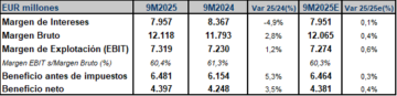 - CABK alcanzó un margen de intereses de EUR 7.957 millones en 9M2025, lo que supone una reducción del 4,9% interanual, principalmente por la bajada de los tipos de interés de mercado, compensado en parte por mayores volúmenes de inversión y la mayor liquidez por el incremento de recursos. Las comisiones netas, por su lado, repuntaron un 5,2% interanual, hasta los EUR 2.923 millones, mientras que el Resultado de operaciones financieras se situó en EUR 180 millones, en niveles similares a los 179 millones del año anterior (+0,8 %). Ambas partidas permitieron elevar el margen bruto hasta los EUR 12.118 millones, una mejora del 2,8% interanual.
