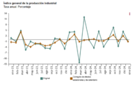 En tasa interanual la producción Industrial, en datos corregidos de efectos estacionales y de calendario, bajó en enero en España el -1,0% (+2,0% en diciembre). En datos no corregidos la producción industrial descendió en España el 1% (+4,3% en diciembre). Por sectores de actividad y en datos corregidos de efectos estacionales y de calendario, la producción de bienes de consumo duradero (3,4%) presentó la mayor tasa anual de crecimiento, seguida de la de bienes intermedios (+1,5%), mientras que la de bienes de equipo fue la que más cayó (-4,7%).