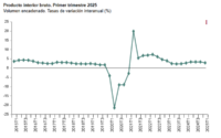 Según la primera estimación del dato, dada a conocer por el Instituto Nacional de Estadística (INE), el Producto Interior Bruto (PIB), medido en términos de volumen, se incrementó un 0,6% en el 1T2025 con relación al trimestre anterior. Esta tasa fue una décima menor que la alcanzada en el 4T2024 y estuvo en línea con lo esperado por el consenso de analistas de FactSet. En el 1T2025 la demanda nacional aportó 0,4 puntos porcentuales (p.p.) al crecimiento intertrimestral del PIB. Por su parte, la demanda externa tuvo una contribución de 0,2 p.p.