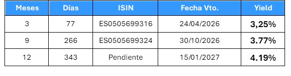 - Última subasta de pagarés a 3, 6, 9 y 12 meses.