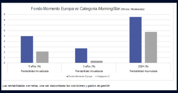 Durante el ejercicio 2024, el Fondo Momento Europa ha alcanzado una atractiva rentabilidad neta del 8,53%, superior a la media obtenida por los fondos comparables, los Mixtos Moderados en Euros, que ha sido del 5,77%.